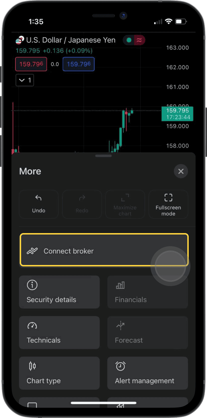 เลือก “เชื่อมต่อโบรกเกอร์” จากเมนูเพิ่มเติม
